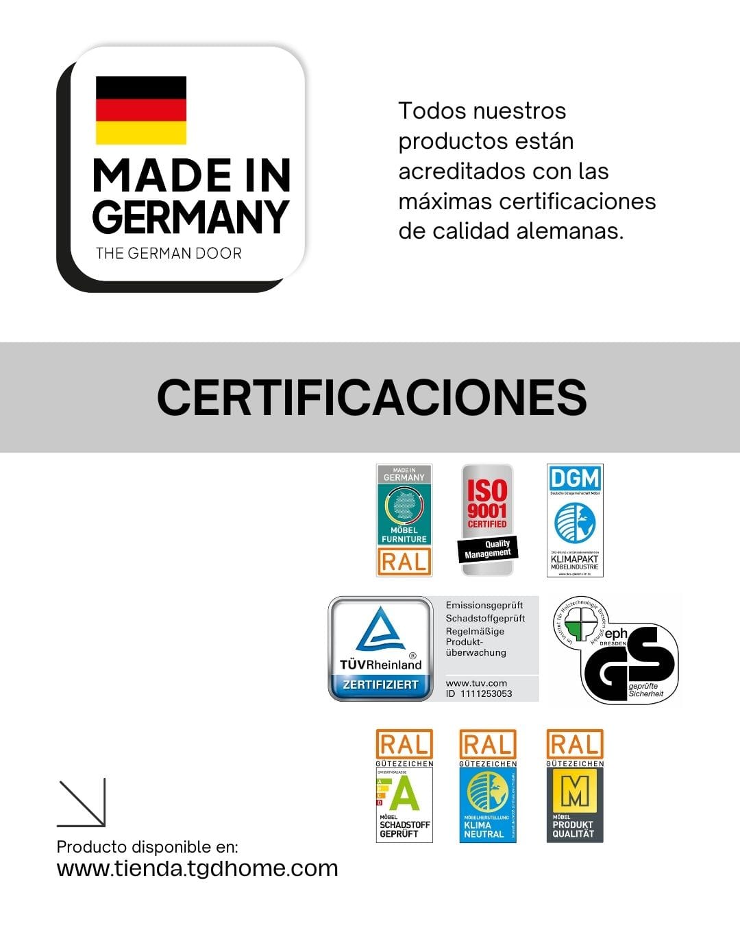 Disponemos de todas las CERTIFICACIONES de fabricación alemana. Y es nuestro compromiso con la sociedad, certificar que las materias primas utilizadas, se han obtenido en bosques sostenibles y bajo una gestión forestal apropiada, que aseguran la supervivencia futura del bosque y mejora la calidad de su flora y fauna.